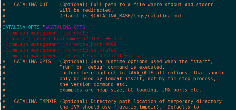 CATALINA_OPTS="$CATALINA_OPTS-Dcom.sun.management.jmxremote-Djava.rmi.server.hostname=192.168.100.117-Dcom.sun.management.jmxremote.port=9999-Dcom.sun.management.jmxremote.ssl=false-Dcom.sun.management.jmxremote.authenticate=false"
