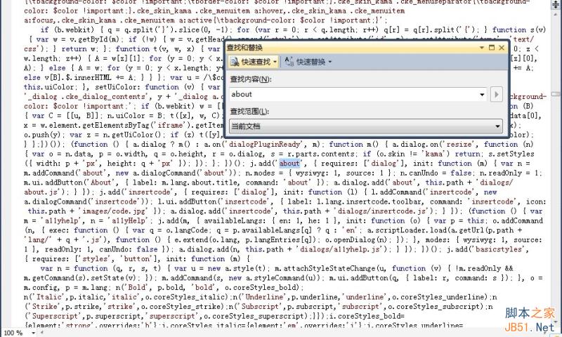 繼續(xù)查找"about",找到"j.add('about',{init:function(l){var m=l.addCommand('about',new a.dialogCommand('about'));m.modes={wysiwyg:1,source:1};m.canUndo=false;l.ui.addButton('About',{label:l.lang.about.title,command:'about'});a.dialog.add('about',this.path+'dialogs/about.js');}});",我們?cè)谶@個(gè)分號(hào)后面增加"j.add('insertcode', {requires: ['dialog'],init: function(l){l.addCommand('insertcode', new a.dialogCommand('insertcode'));l.ui.addButton('insertcode', {label: l.lang.insertcode.toolbar,command: 'insertcode',icon: this.path + 'images/code.jpg'});a.dialog.add('insertcode', this.path + 'dialogs/insertcode.js');}});"。