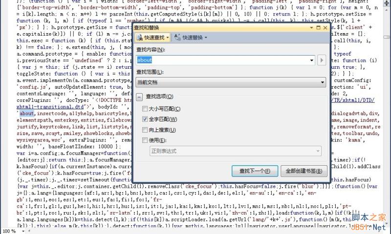 接下來(lái),我們就把高亮插件插入到ckeditor里來(lái),找到ckeditor文件夾下的"ckeditor.js"。按ctrl+F查找"about",找到"fullPage:false,height:200,plugins:'about,basicstyles",我們?cè)?about"后面增加",insertcode",這里就變成"plugins:'about,insertcode,basicstyles"。