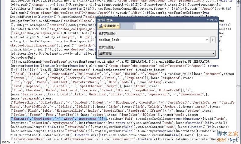 接下來(lái)繼續(xù)在ckeditor.js查找"i.toolbar_Basic=",這就是CKEditor默認(rèn)的工具欄了,我們?cè)谶@里加上",insertcode",比如我的"['Maximize','ShowBlocks','-','insertcode']"
