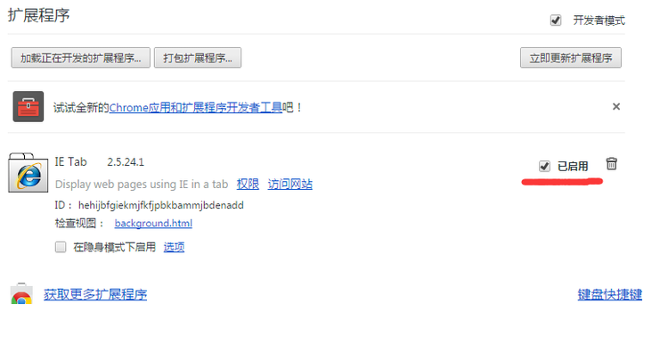 如果使用后一種方式,那么無法直接安裝(下載和安裝會顯示在瀏覽器的左下角),Chrome一直提示無法正確安裝。之后,我在瀏覽器左下角打開下載目錄,將“ietab2.5.24.11.crx”直接拖入Chrome中,居然成功了!