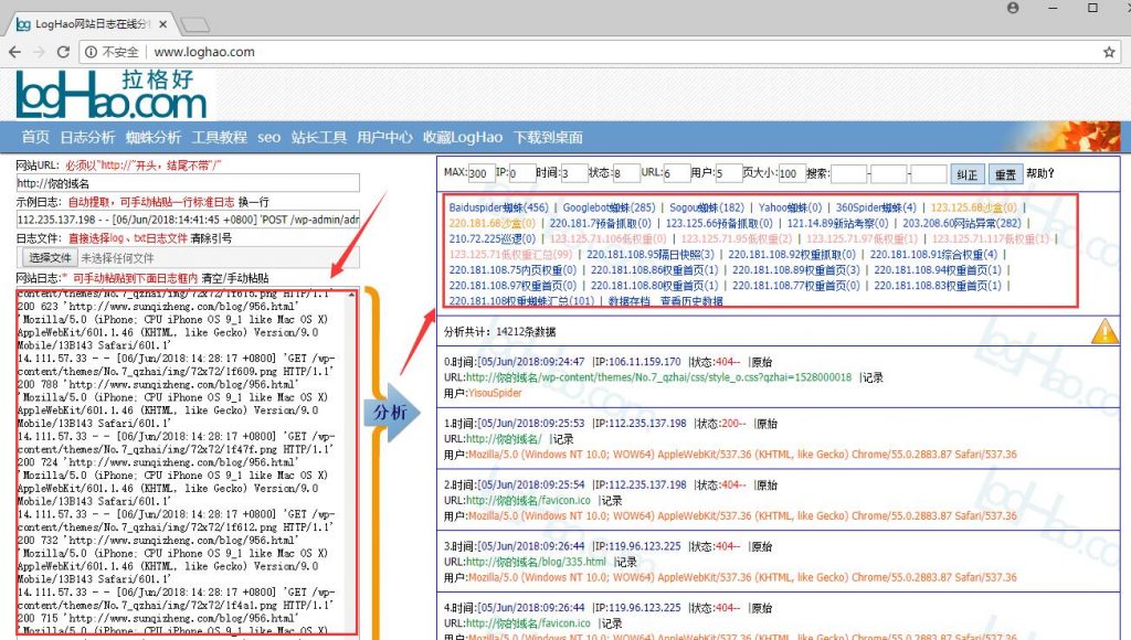 將網站日志所有內容復制粘貼到左側,然后點擊分析按鈕,就能方便的查看搜索引擎爬蟲的爬取記錄了。