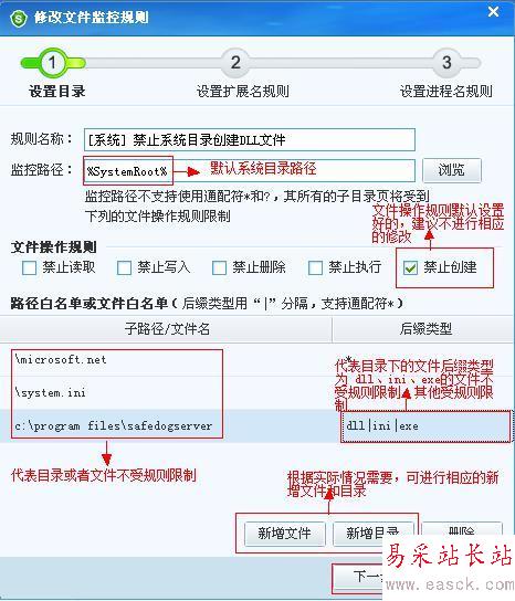 規則的設置分為三個步驟:設置目錄—》設置擴展名規則—》設置進程名規則