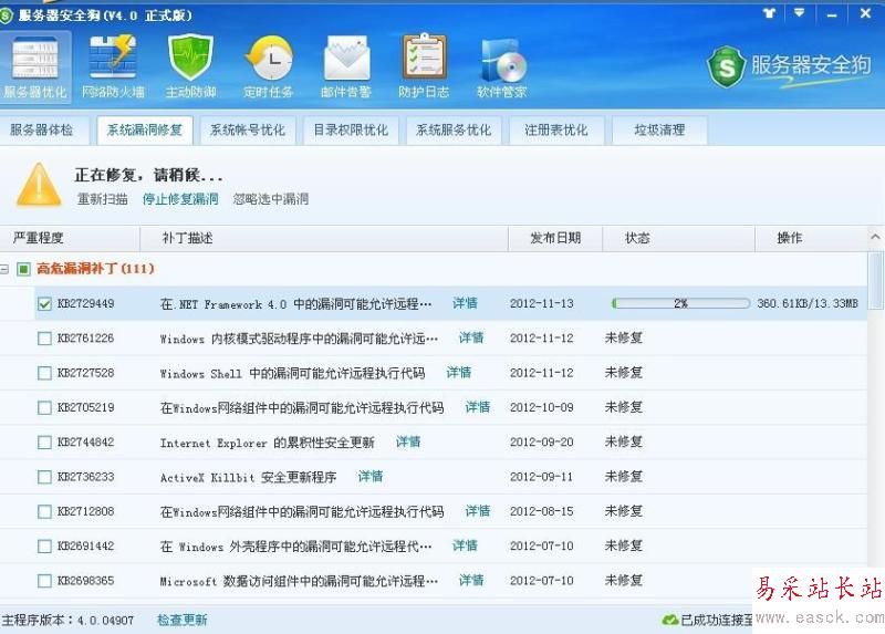 在系統漏修復過程中,如果用戶不想修復該漏洞,可通過選擇“停止修復漏洞”隨時停止系統漏洞修復。在下次再進行漏洞修復時,系統就會從停止處繼續漏洞修復進程。如本例中系統漏洞補丁KB2729449修復進度條顯示修復進程完成2%,如果我們現在暫停此修復操作,下次重新進行漏洞修復時,系統會從讀取之前的修復進程,直接從2%處開始。