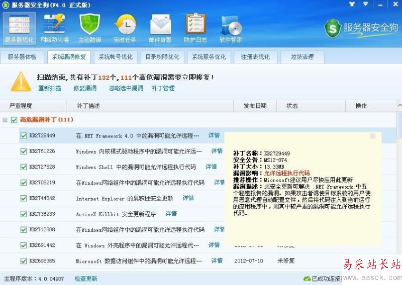 勾選漏洞補丁KB2729449,系統漏洞修復功能界面點擊“詳細”即可顯示該漏洞補丁詳細信息,選擇“修復漏洞”即可完成該補丁的修復。