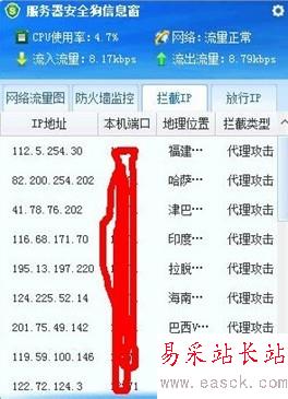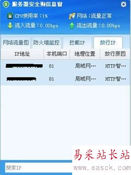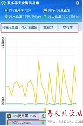若用戶想詳細的了解懸浮窗口的信息,只需將鼠標移動到懸浮窗口上,左鍵單擊,便可彈出整個詳細的信息窗口,包含了:網絡流量圖、防火墻監(jiān)控、攔截IP、放行IP,可以便捷查詢服務器的情況。如圖所示: