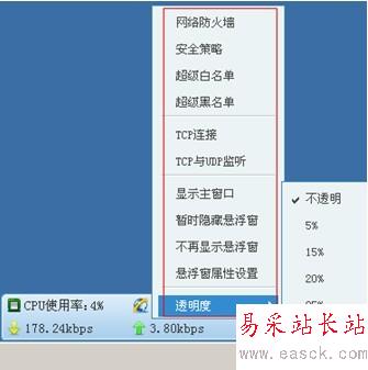 同時,用戶還可以根自己的實際使用情況對“懸浮窗口”設置。將鼠標移動到懸浮窗口上,右鍵點擊,便可彈出對話框,用戶可根據需求,對各功能進行設置。下圖是懸浮窗透明度的設置: