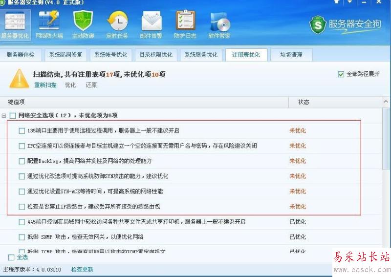 選擇“重新掃描”可對注冊表項進行重新掃描,以檢測需要優化的注冊表項。建議用戶定時掃描系統注冊表,并根據掃描結果,對所有掃描結果提示需要優化的注冊表項進行優化。