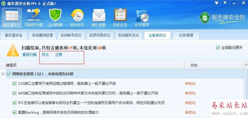 同時,用戶可以通過手動逐個選擇注冊表項,也可以使用“全選/全不選”批量選擇注冊表項,之后選擇“優化”或者“還原”對被選擇的注冊表項進行操作。