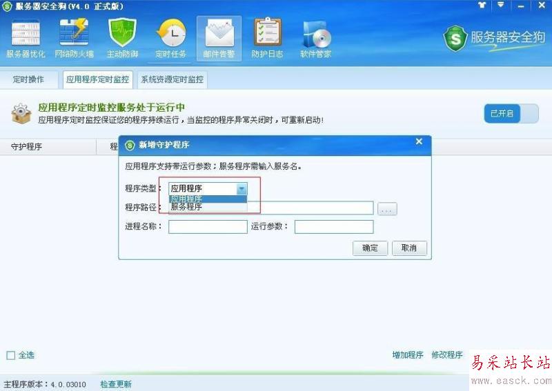 下面我們以添加服務器安全狗程序為例,來詳細看看該功能的設置情況: