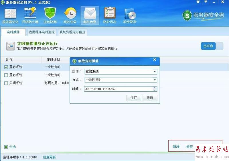在使用服務器安全狗定時操作功能時,建議用戶開啟定時操作功能,這樣方便用戶設定時間進行關機與重啟操作。同時,用戶可以設置重啟服務器或者關閉系統的時間間隔周期,以達到自動化處理的目的,為用戶節省重復操作的工作量。不僅如此,在定時任務功能下,用戶還可以根據實際情況新增加,修改或者刪除設置重啟系統或者關機的任務計劃。