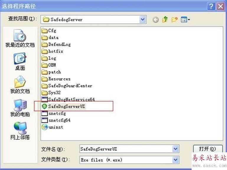 在“選擇路徑”窗口選取正確的應用程序執行路徑,本例我們守護的是服務器安全狗操作界面,所以選擇“SafeDogServerUI”。