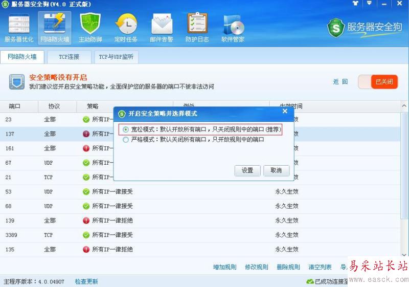 對新手用戶,在不熟悉端口原理的情況下,建議選擇系統(tǒng)推薦的“寬松模式:默認(rèn)放開所有端口,只關(guān)閉規(guī)則中的端口”。
