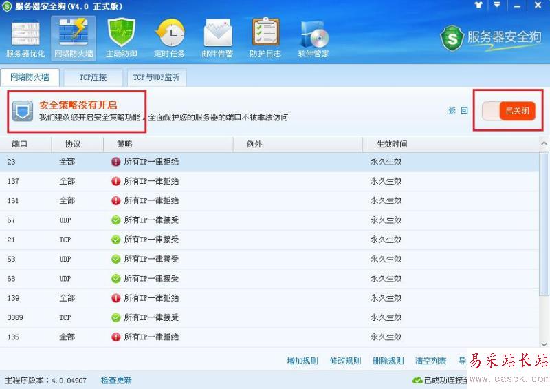 用戶可以通過單擊操作界面右上方的按鈕“已開啟”/“已關(guān)閉”按鈕來開啟/關(guān)閉安全策略功能。用戶必須開啟安全策略功能,所有端口保護(hù)規(guī)則才會生效,否則所有關(guān)于端口的設(shè)置都為無效。如下圖所示: