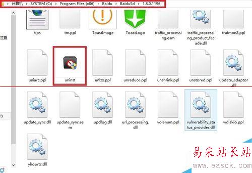 2、進入百度殺毒安裝路徑:C:/Program Files (x86)/Baidu/BaiduSd/1.8.0.1196,默認安裝路徑在C盤系統盤,1.8.0.1196是版本號,不同人的版本號可能不同,不會影響,找到文件夾下的uninst卸載程序-雙擊。