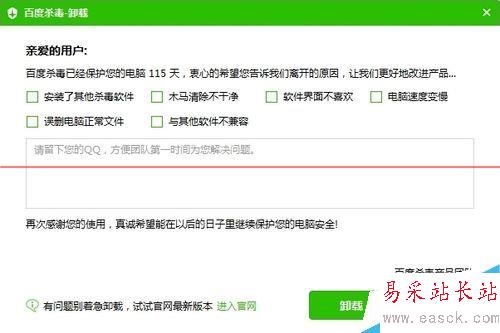 3、選擇卸載百度殺毒的理由,木馬清除不干凈等理由建議都選一下,讓百度殺毒改進其殺毒軟件的性能-卸載。