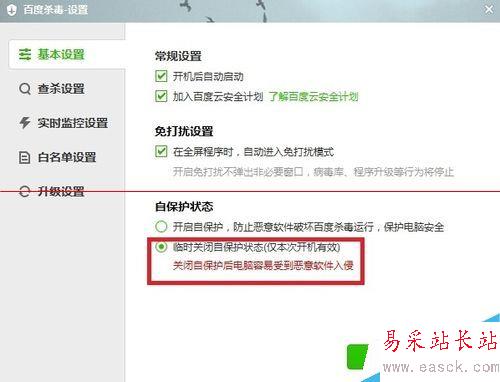 1、打開百度殺毒-設置-基本設置-自保護狀態-臨時關閉自保護狀態(僅本次開機有效)-確定。不用管百度殺毒關于關閉自保護后電腦容易受到惡意軟件入侵的提示。