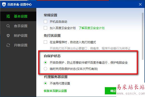 在基本設置中“自保護狀態”,點擊“開啟自保護,防止惡意軟件破壞百度殺毒運行,保護您的電腦安全運行"