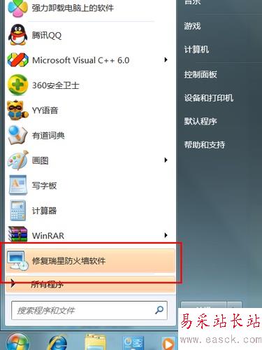 下面以Win7系統為例,教大家如何卸載瑞星個人防火墻。具體方法為,進入開始菜單,然后找到修復瑞星個人防火墻這個軟件的功能選項,如下圖所示(用戶也可以進入電腦控制面板,然后進入卸載程序界面進行操作,此方法也適合Win8)。