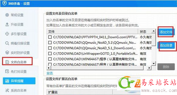 第二步、在360殺毒設置窗口中,選擇文件白名單,根據(jù)需要點擊右側的【添加文件】或者【添加目錄】進行添加,最后點擊確定即可。