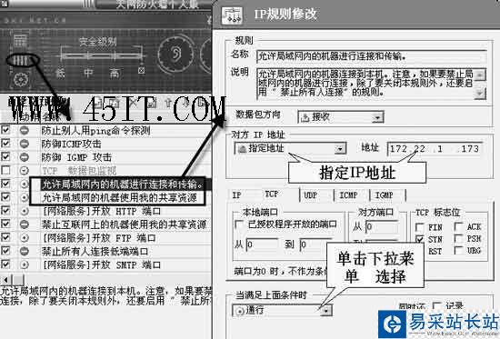 果凍提示:我們也可以只允許局域網內的某臺電腦訪問自己的共享資料,以達到保密的目的。在防火墻主面板上點擊“IP規則管理”按鈕,在彈出的IP規則列表中找到和局域網訪問相關的規則并雙擊它,進入“IP規則修改”對話框,按照圖2所示進行設置即可。
