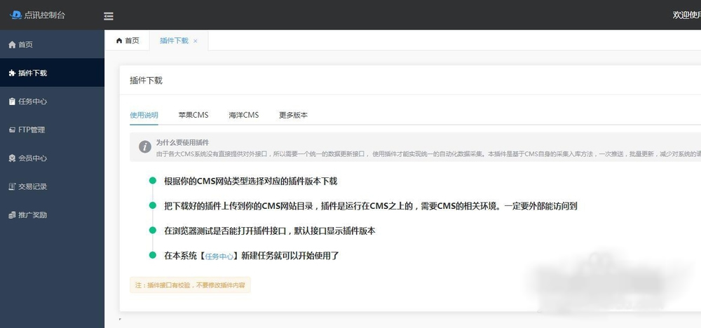 然后登陸點(diǎn)訊控制臺(tái),先進(jìn)入【插件下載】下載CMS對(duì)應(yīng)的插件,然后上傳到你的CMS上,需要能訪問到