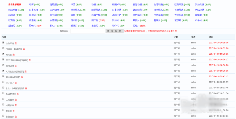選擇收費資源,打開采集列表,綁定分類,選擇資源,進行采集工作!