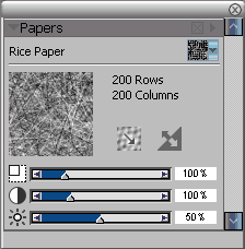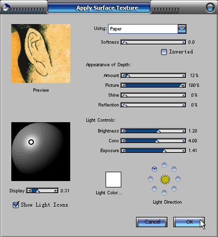 8.合并所有圖層,使用【rice paper】的紙紋。執行【effects】/【surface control】/【apply surface texture】(效果/表面控制/運用表面紋理)的菜單命令。在【apply surface texture】的對話框中設定using的選項為paper,shine的數值改為0,amount的數值調節為12%左右。這樣整個畫面就會被添加上一層自然的紙紋效果。