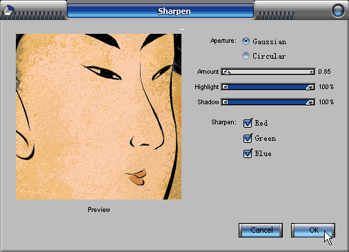 9.繼續執行【effects】/【focus】/【sharpen】(效果/焦點/銳化)的濾鏡。調節一個較小的銳化數值,增強畫面質感。