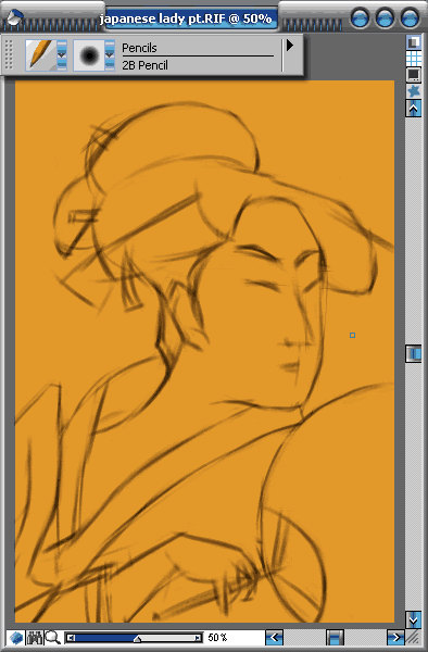 2.按【ctrl+4】的組合鍵打開【layers】(圖層面板),新建一層。按【b】鍵切換到筆刷工具,使用【pencils】/【2b pencil】(鉛筆/2b鉛筆)的筆刷變體,選用一種中性灰色,在新建圖層上起稿,圖層自動會變成【gel】的模式。用【2b pencil】畫出人物的大概輪廓和形體分布比例位置。