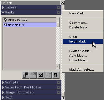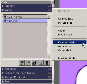 12.在mask面板右上角的下拉菜單里面選擇invert mask(反轉遮罩),這樣遮罩的顏色范圍就到了人物以外的背景。然后繼續執行feather mask(羽化遮罩)的命令,這樣可以使以后的選區邊緣更加柔和。