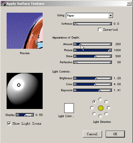 15.繼續保持選區的浮動,到papers(紙紋面板),選用basic paper的紙紋。ctrl+/打開運用紋理的對話話框,把對比度降低一些,亮度調高一些。如果覺得紋理效果過頭了,那么可以用fade的命令來減弱一些之前執行的效果。