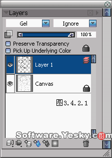 2.新建一層,設為gel模式,使用【pens】/【ball point pen 1.5】(鋼筆/圓珠筆1.5號),使用黑色,根據下層的草稿描畫。(圖3.4.2.1和圖3.4.2.2所示)