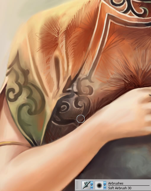9.衣服上的裝飾圖案紋理也是根據(jù)由簡(jiǎn)入繁的順序,逐步刻畫,局部盡量服從整體關(guān)系。這時(shí),intuos3數(shù)位板就發(fā)揮出了他的最大功能,可以讓你以非常高的效率,很精細(xì)、快速的畫出所需要的紋理。這樣的工作如果沒有intuos3,將很難完成。