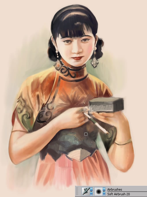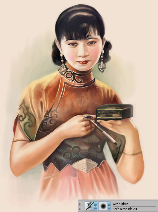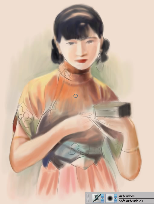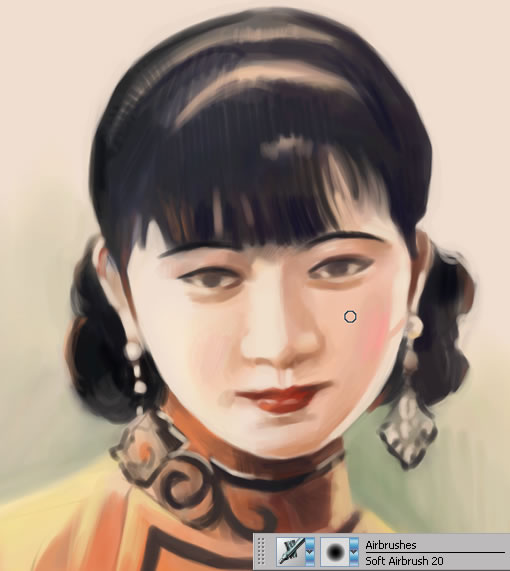 4.使用小一號(hào)的soft airbrush 20進(jìn)行色彩的深入,并結(jié)合素描關(guān)系,塑造出基本的人物形象。