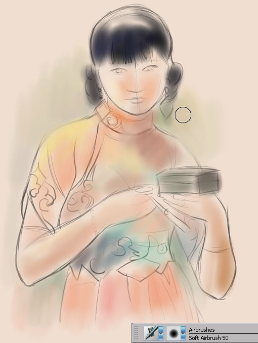 3.選用airbrushes/soft airbrush 50,進(jìn)行初步的色彩渲染。