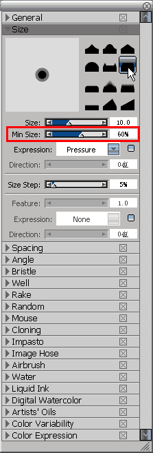 5.為了更好地塑造形體,把soft airbrush 20的筆刷修改一下設(shè)置,切換一個(gè)平頭的筆刷頭樣式,并把筆刷的min size改為60%,形成一個(gè)軟硬適中的圓頭畫筆。