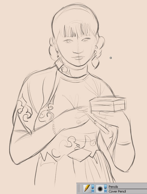 2.使用pencils/cover pencil的畫筆,勾勒出大致的輪廓和形體分布。如同紙上鉛筆素描一般,intuos 3的舒適手感,絲毫不會(huì)影響你在數(shù)字媒體上的創(chuàng)作流暢性。