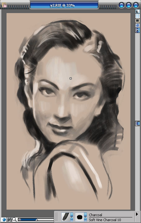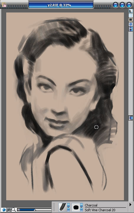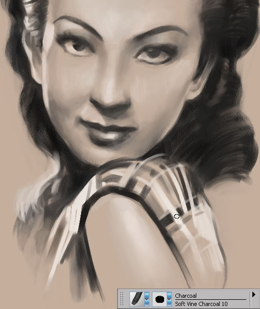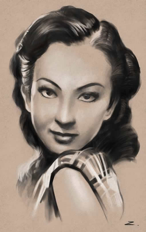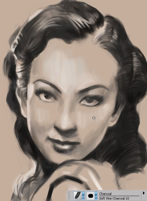 很多月份牌年畫的仕女形象都是參照了當時的一些紅歌星和影星的照片,比如這次的實例中,我們采用了30年代紅極一時的女歌星周璇的形象作為月份牌的主角。和傳統的炭精粉擦筆素描技巧相比,用軟件表達這樣的炭畫效果更加簡便。