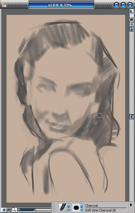 5.用稍微小一號的charcoal/soft vine charcoal 20進行整體關系的加強,并畫出基本的五官形狀和位置。