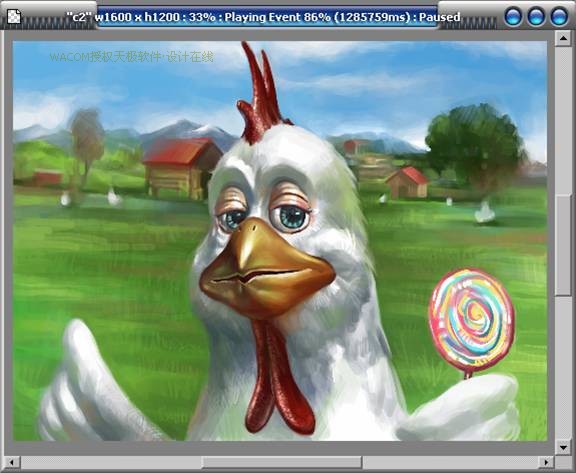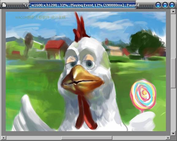 11.刻畫雞冠的部分,用點狀的筆觸表達特定的紋理質(zhì)感,同時注意和整體體積的依附關系。opencanvas3 的軟件對于intuos 3數(shù)位板的支持非常優(yōu)秀,可以充分利用運筆壓感來控制筆觸效果,非常便捷。