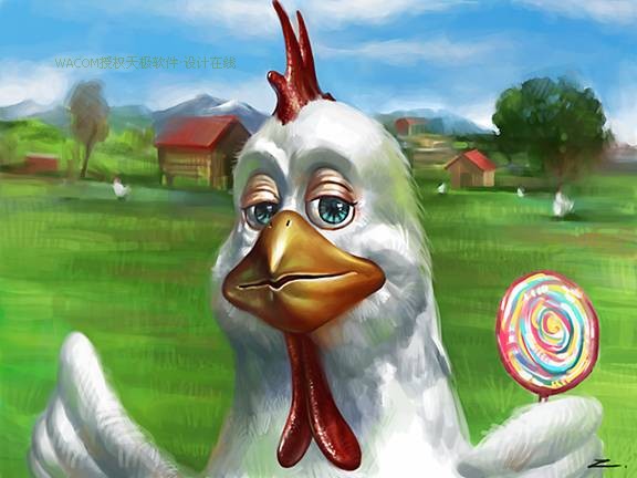 這是一張卡通風格的作品,創(chuàng)作靈感來自于一張3d渲染圖。我們在參考圖的基礎上做了一些調(diào)整和再創(chuàng)作,增加了一個彩虹棒棒糖(《功夫》看多了……)。為了達到更加生動和擬人化的效果,我們強化的眼睛的細節(jié)部分,重點刻畫了睫毛和瞳仁,讓這個卡通雞看起來更加生動、可愛。