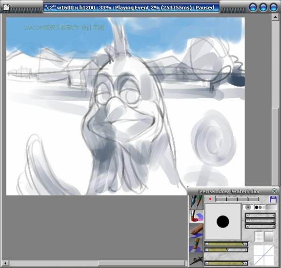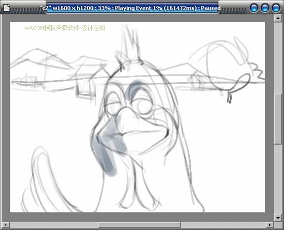 6.開始塑造主體對象,畫出卡通雞的頭部體積關系。由于intuos3數(shù)位板的1024級壓感筆等功能,使得從草圖到上色都可以非常自然的完成。