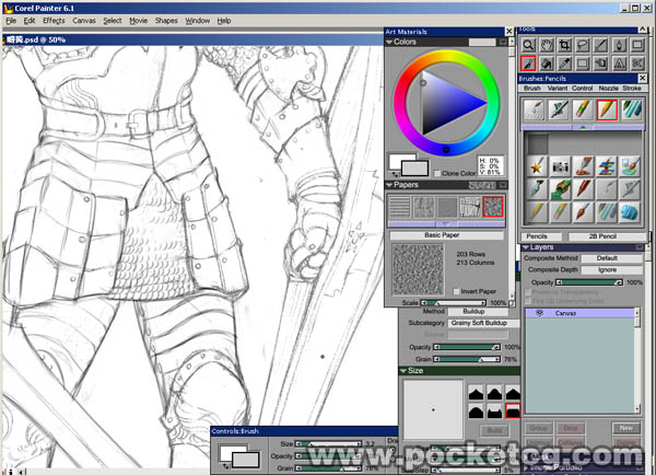 在painter6.1中打開稿子,由于對人物造型的不滿意以及一些新發現的結構問題,我決定修改草稿。選擇【pencils】畫筆中的【2b pencil】變量工具,在【basic paper】紙張紋理下,選擇淺灰色來修改草稿。