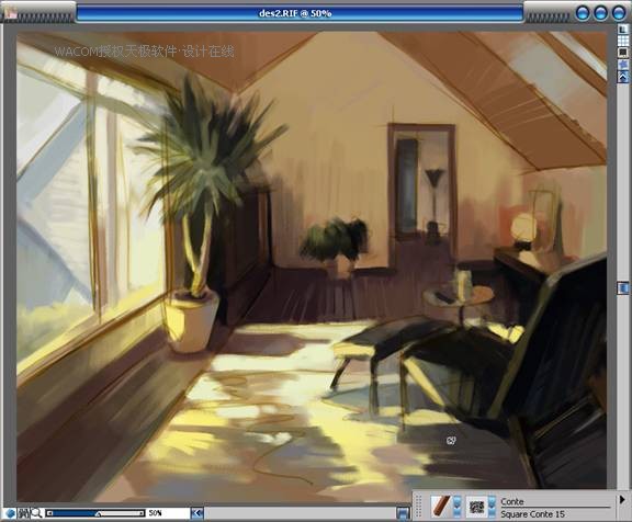 3.回到canvas層,使用conte/square conte 22的筆刷進行初步的上色,畫出主要的光影區域。這張效果圖,我將重點表現光影效果,給畫面增添一些戲劇性的效果。