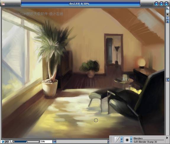 10.使用blenders/soft blender stump 30的筆刷,調和一下局部的筆觸和色彩,產生更加柔和的整體效果。