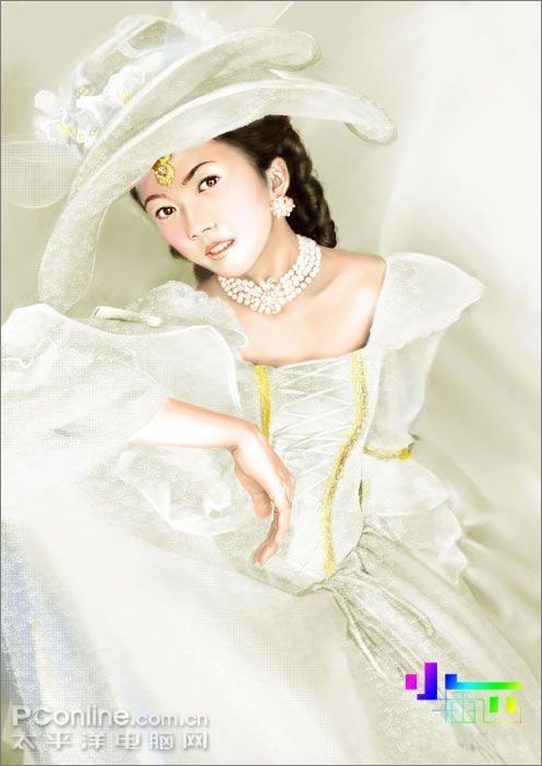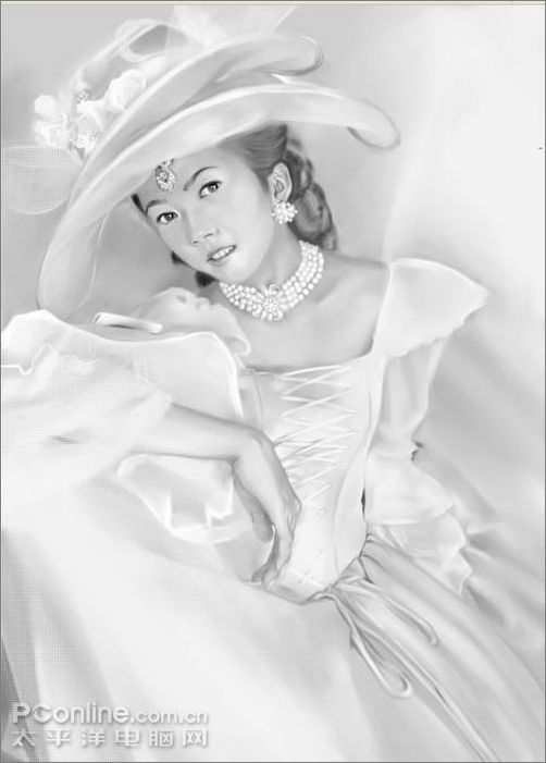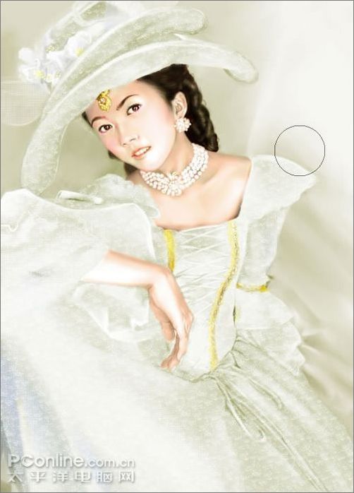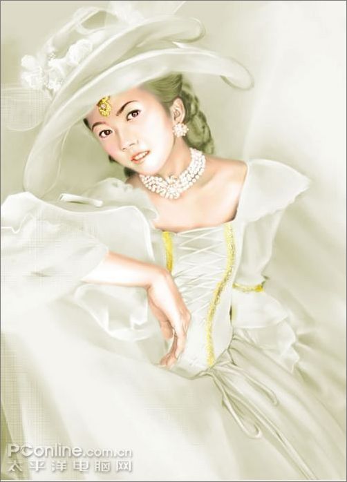 9、還是用噴筆畫出項鏈和耳墜,話的時候可以提高一下不透明度,然后用粉蠟筆中的硬制粉蠟筆將紙紋調成精細網點,畫出帽子和衣服上的紗,此處注意筆觸,要虛實分開。