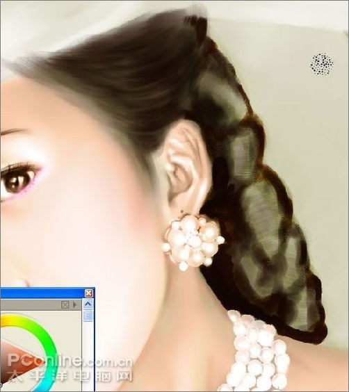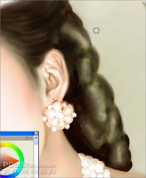 17、現在轉到pt里,我感覺pt畫頭發方便,它可以很方便的旋轉畫布。先新建一層,用噴筆畫出暗面,然后再用炳稀畫筆里的干畫筆在高光處用棕色畫幾筆,讓他有發絲的感覺。