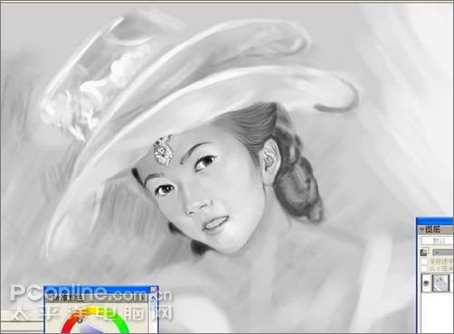 8、衣服和背景全部搞定,這步之前全部是用黑白2色畫的,注意!眼睛也畫出來了,點上高光確實有神多了,沒白忙半天...現在你離顯示器10米,看像不像照片,一定得10米啊,不然該看見畫了......