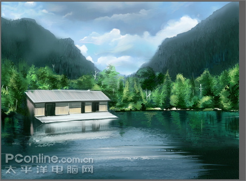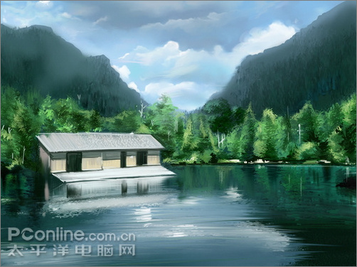 3、這里我選用載色刮刀結合數碼板的壓感繪制的房屋。然后轉成薄刮刀融和畫面的顏色,尤其是水面。還是印象派油畫筆繼續加工樹木。